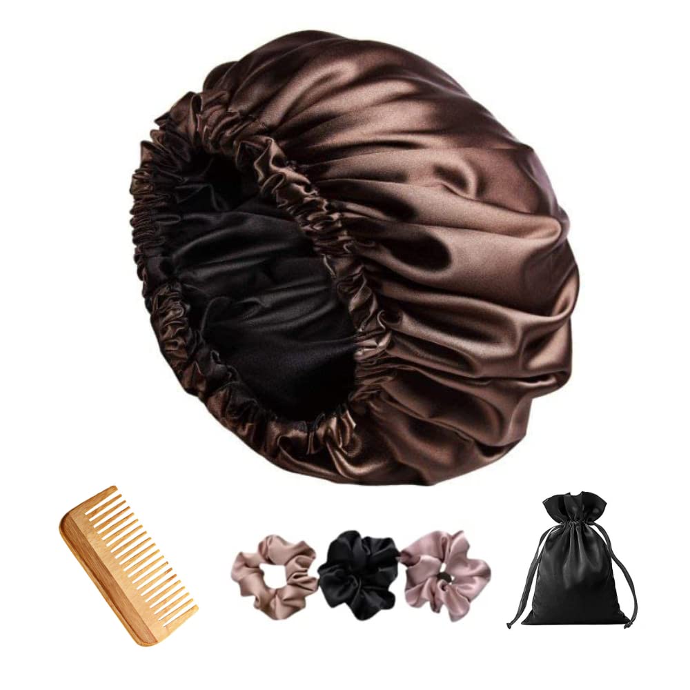 SNARKY Satin Silk Hair Bonnet cap with 3 Primium Silk Satin Scrunchies|Satin head cap for sleeping| Satin bonnet for curly hair| Silk bonnet for hair|Satin hair wrap(coffe)